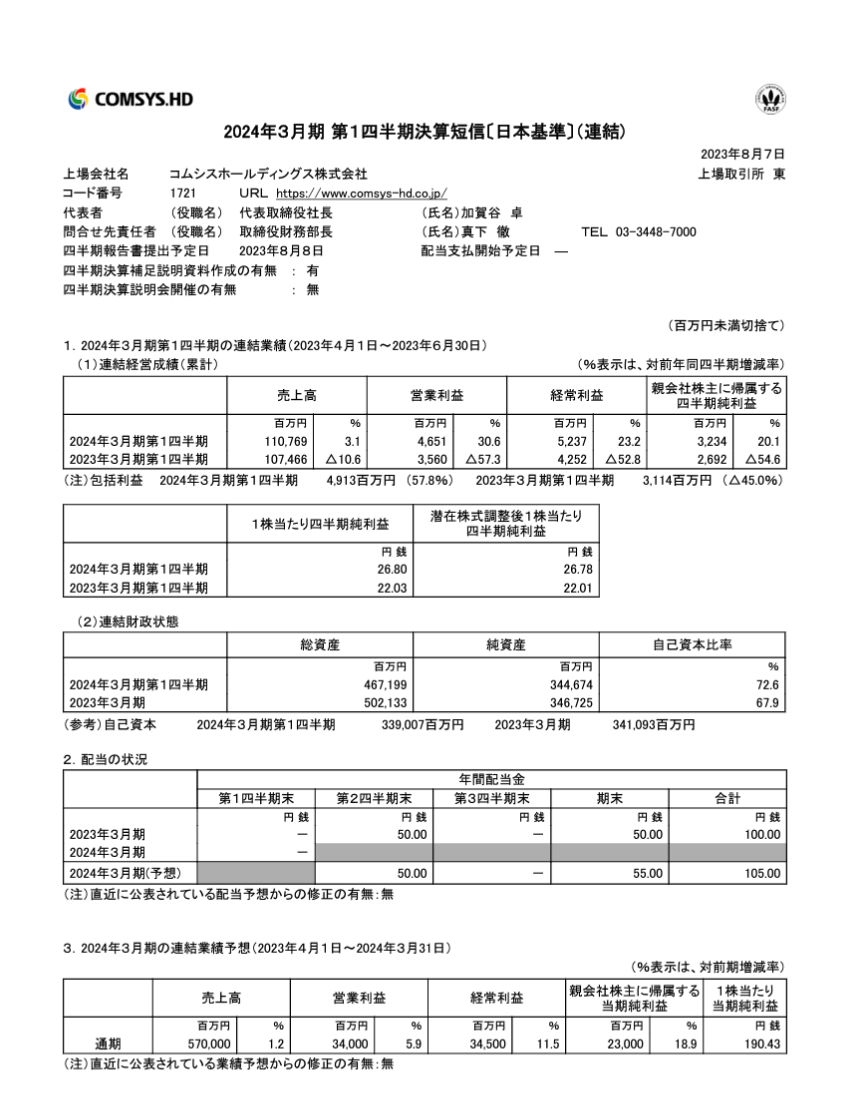その結果、コムシスホールディングスの株価は2023年8月22日、前日比▲0.8%の下落となりました。