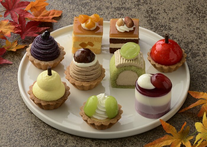「秋の訪れをスイーツで楽しんで欲しい」という思いから生まれたこちらの商品は、秋に収穫できる野菜や果物をプチケーキで表現。フォルムがキュートな「りんごのタルト」やシャインマスカットとヨーグルト風味ホイップクリームが調和する「マスカットのタルト」のほか、モンブランは、紫いもと渋皮栗の2種類のアソートが楽しめます。