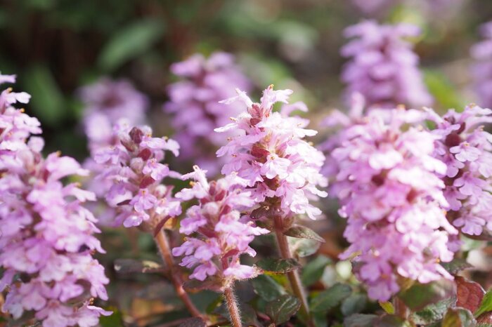 グランドカバープランツとして、おすすめのアジュガは、秋に似合う大人っぽい葉色が特徴の多年草。銅葉カラーの葉は秋ガーデンをシックに演出します。