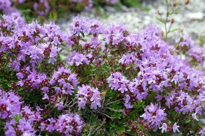 グランドカバーにおすすめのクリーピングタイムは、ほふく性のあるハーブ。草丈が低く、踏まれても枯れることのない強健さです。