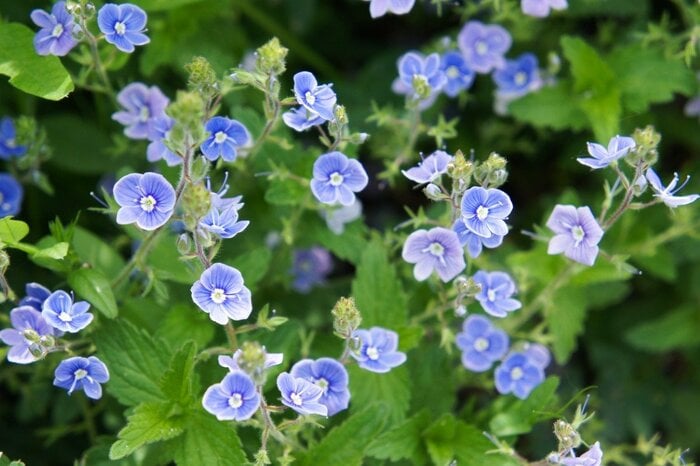 品種が豊富なベロニカのなかでも、草丈が低く、ほふくして生長するのがベロニカ・オックスフォードブルー。植えっぱなしでも生長する強健さで、春にパープルの可愛らしい花を咲かせます。