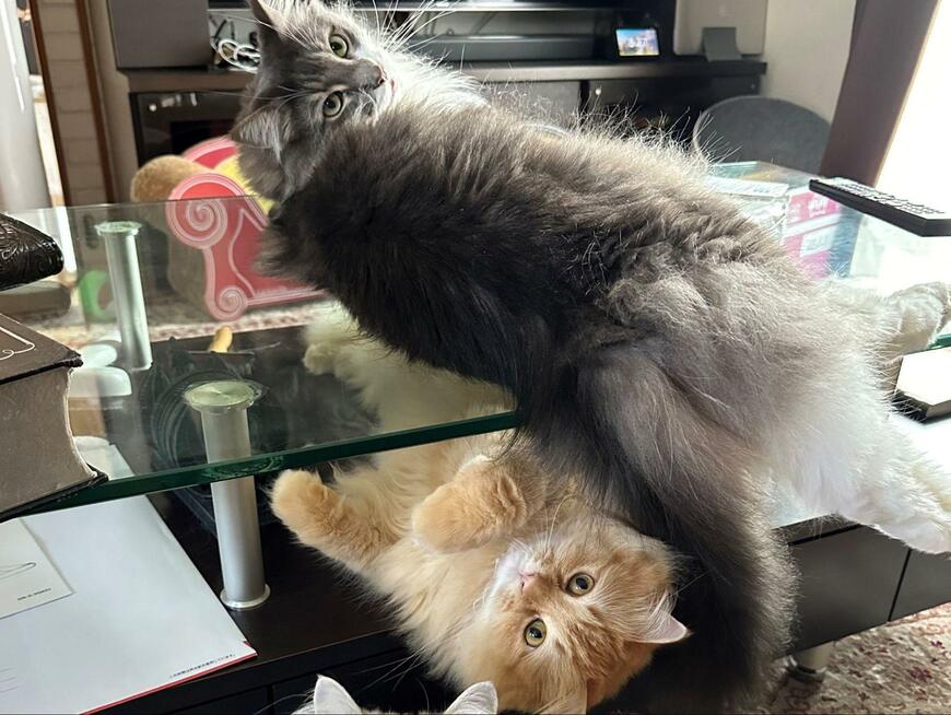 テーブルの上には「レイ」くんが横たわり、キリリとした表情でこちらを振り向いています。そしてそのすぐ下には「エマ」ちゃんがゴロンと仰向けになってくつろいでいました。警戒心の感じられないくつろぎ姿に、思わずホッコリしてしまいます……!