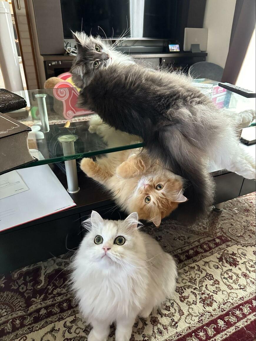 テーブル周辺で渋滞する3匹の猫ちゃん