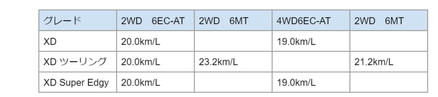 現在設定されているディーゼルエンジンは1.8LのSKYACTIV-D 1.8が搭載されており、WLTCモード23.2km/L(XDツーリング2WD 6MT)を達成しています。