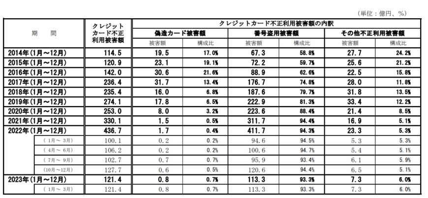 日本クレジット協会の調査結果(※)によると、最も多い被害はクレジットカードの番号の盗用によるもので、被害額の9割以上を占めています。