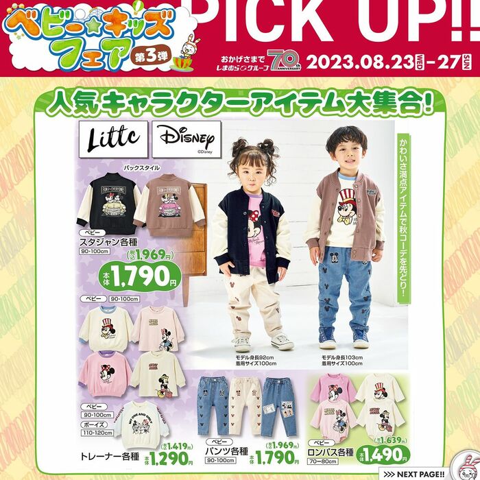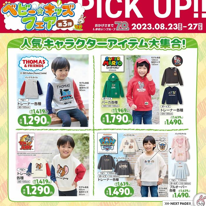今回はディズニー100周年アイテムとともに、アンパンマンやトーマス、マリオ、パウパトロールなど人気キャラクターとコラボした秋のベビーウェア&キッズウェアがもりだくさん。