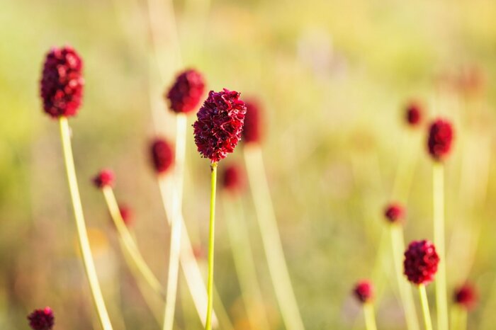 赤紫の小さな花穂がオシャレなワレモコウ。細い茎の先についたダークレッドの花色が大人っぽく、印象的です。