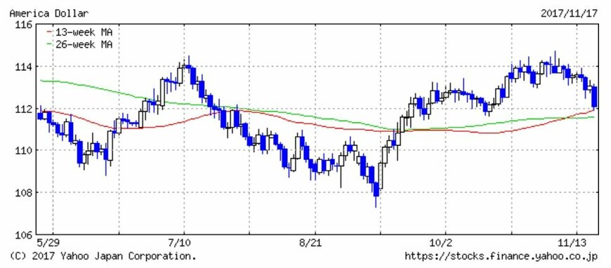 10~11月の日経平均の上昇にほとんど反応することなく114円台で跳ね返されてしまったドル/円ですが、先週は日経平均の下落に相関するようにドル/円も下落。上がるべきところで上がらず、下がるところで下がるという、相場の理不尽さを感じさせる日経平均とドル/円の値動きとなっています。
