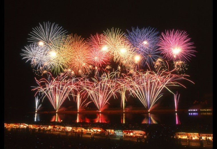 今年は、昨年から7000発を増やした約1万5000発の打ち上げ花火が70分間打ち上がります。5か所の会場と河川敷には約350もの露店が軒を連なるため、花火だけでなくお祭り気分も一度に楽しめます。