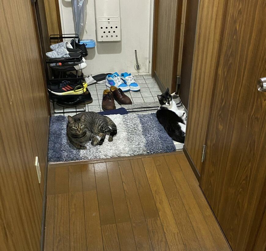 玄関で飼い主さんを待ち構えていた、猫ちゃん達の姿がX(旧Twitter)で注目を集めています。