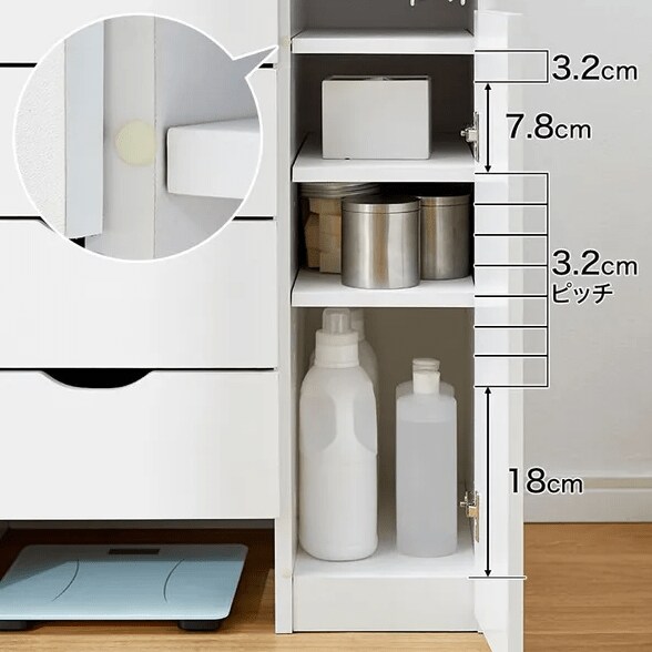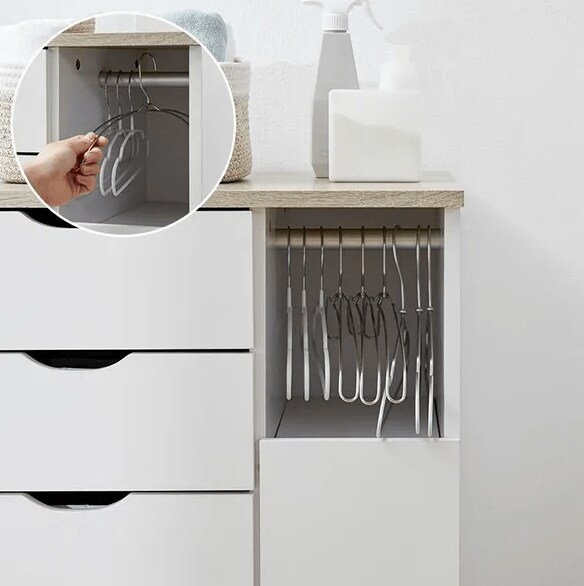 すっきり見せたい洗面所ですが、必要なものは多く、また形状もさまざまです。LOWYAのランドリーチェストはハンガーや体重計をすっきり収納できるスペース、小物を無駄なく収納できる可動式の棚などを備えているので、スマートと収納力が両立します。