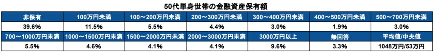 次に、50歳代おひとりさま世帯の貯蓄額を確認しましょう。金融広報中央委員会「家計の金融行動に関する世論調査[単身世帯調査](令和4年)」によると、50歳代単身世帯の金融資産保有額は以下のとおりです。