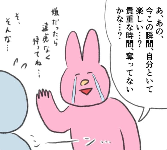 ウサギと友人は休日に待ち合わせて出かけていました。ですが、どこかウサギはどこか浮かない顔。「自分との時間、楽しいかな?」「あなたの貴重な時間を奪ってないかな?」と不安で友人に聞いてしまうのでした。