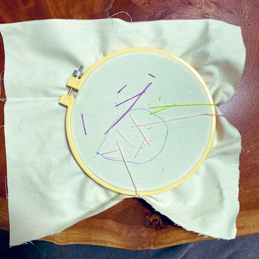 そして仕上がった作品がこちら。布には、紫やピンク、緑といった色とりどりの糸がちりばめられています。短い所や長い所があったり、ときにはダイナミックに枠からはみ出したり。作品からは、女の子が刺繍のひとときを存分に楽しんでいたことがうかがえて、ホッコリとした気持ちになりますね。
