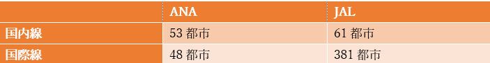 まずは、就航都市数を比較してみましょう。ANAとJALの就航都市数を以下の表にまとめてみました。