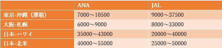 貯まったマイルは、特典航空券に交換できます。できるだけ少ないマイルで、長距離路線の特典航空券に交換できればお得ですよね。ANAとJALの特典航空券の交換レートの目安は以下の通りです。