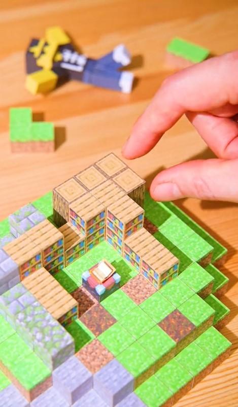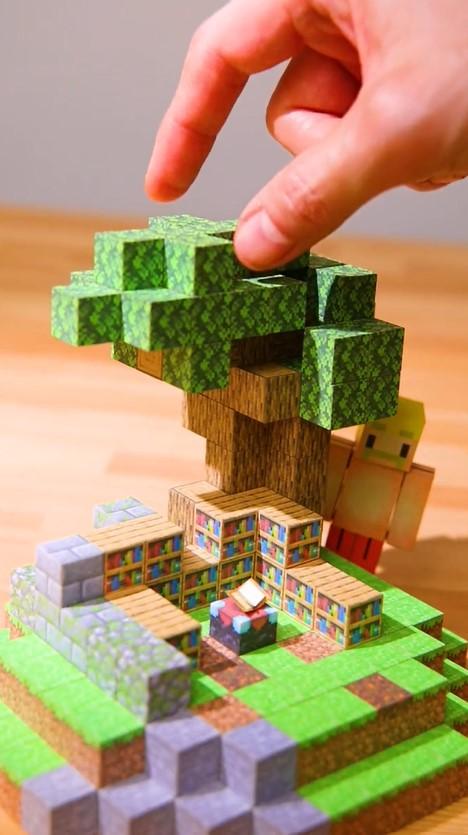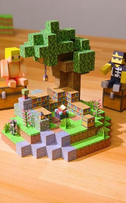 葉っぱのブロックが積み上がると、徐々に木のフォルムが見えてきました。木陰には村人らしきキャラクターの姿も見えますね。ブロック同士がくっつく動きや音まで実物そっくりの仕上がりとなっており、思わず見入ってしまいます。