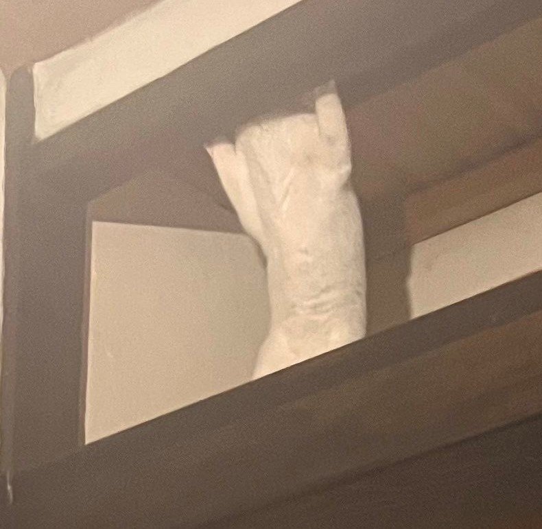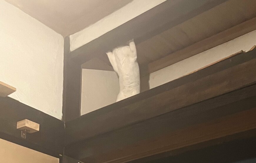 注目を浴びているのは1匹の白猫ちゃんです。写真には、押し入れの上の収納スペースでしょうか、高所で力強い立ち姿勢を見せる猫ちゃんの姿がおさめられています。
