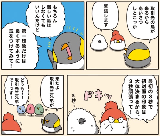 「3秒で決まる第一印象」というコメントとともに投稿されたのは、4コマの漫画でした。