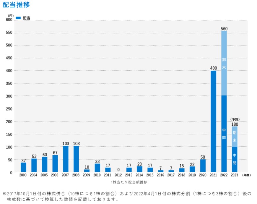 最後に商船三井の株価と配当金の推移を確認しましょう。