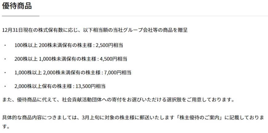 100株保有の場合、2500円分の商品が提供されます。ただし。12月31日基準日の株主の中から、100株(1単元)以上を 1年以上継続保有していることが条件になるため、今回は受け取れません。そのため試算では0円となります。