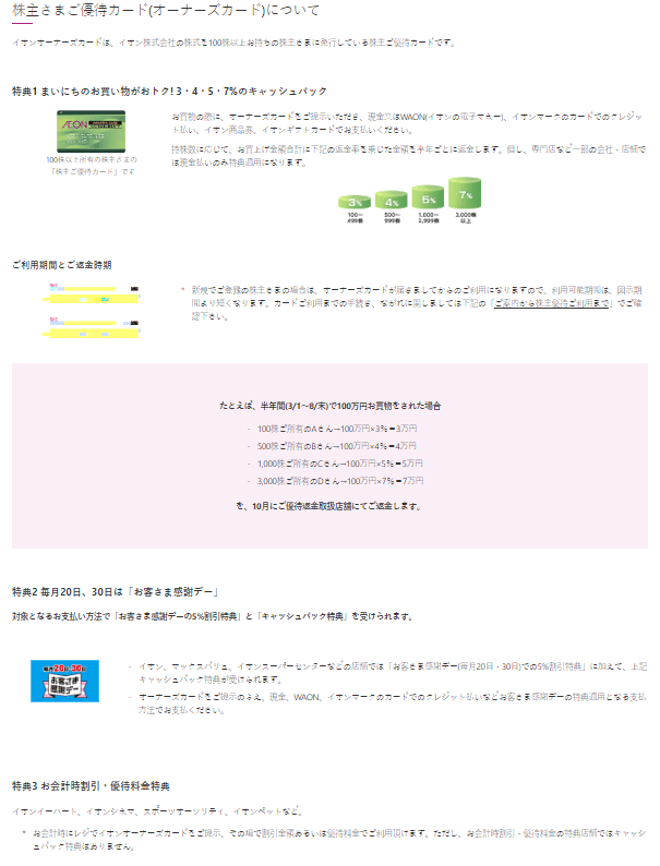 イオンは決算期(2024年2月期)現在、100株以上保有する方に向けて「株主さまご優待カード(オーナーズカード)」を年2回、提供しています。