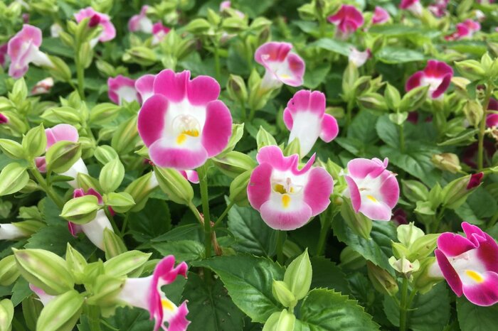 暑さに強く夏の定番花となっているトレニア。筒状花の先が分かれて唇のような形をした花弁がユニークです。
