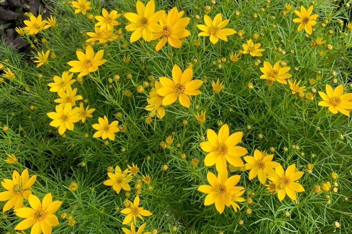 コレオプシスはキク科の植物で5~9月まで開花。花色は黄・赤・オレンジ・ピンクといった暖色系が豊富です。細い葉茎が柔らかく優しい印象。