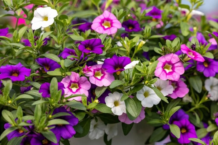 カリブラコアはペチュニアに似た小さな花が可憐。4~11月まで咲き続け、枝を分岐しながらこんもりとした姿で多くの花を付けます。