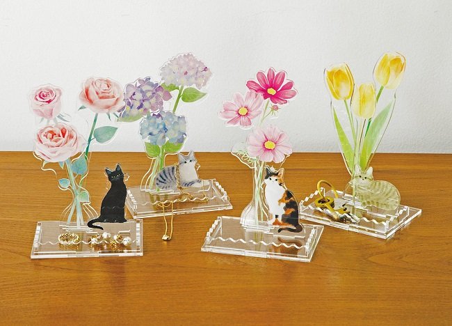 フェリシモ「いつまでも美しい お花のアクリルスタンドトレイ」は全4種類! 花や猫を自分好みに組み合わせて楽しめます