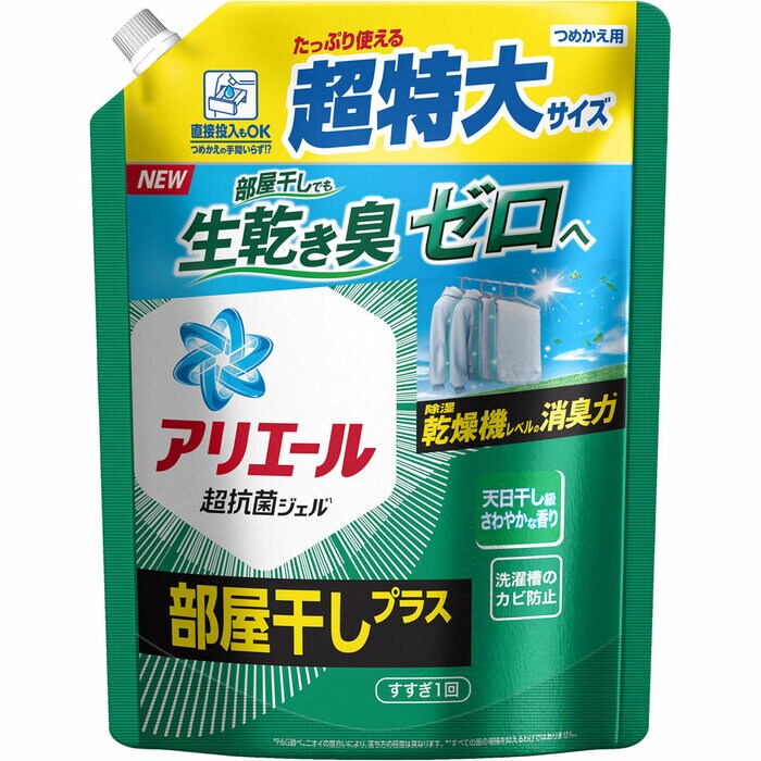 部屋干ししても生乾き臭ゼロへ!アリエールの詰替え用パックです。たっぷり使える超特大サイズで、ストックにも便利。