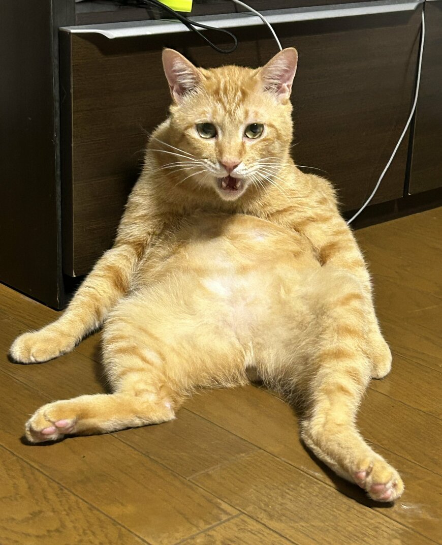 注目を浴びているのは元保護猫のリチャードくん。写真に写るリチャードくんは、お腹を丸出しにして座り、まるで人間のようなくつろぎぶりを見せています。