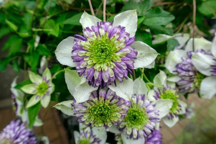 「エトワール バイオレット」は、クレマチスらしい、美しいパープルが特徴的な一重咲きの品種です。四季咲き性で、花つきがよく、壁面などに誘引すると見ごたえのある修景を楽しむことができます。