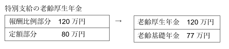 報酬比例部分120万円はそのまま老齢厚生年金となりますが、定額部分80万円が老齢基礎年金になる際は、77万円になってしまいます。