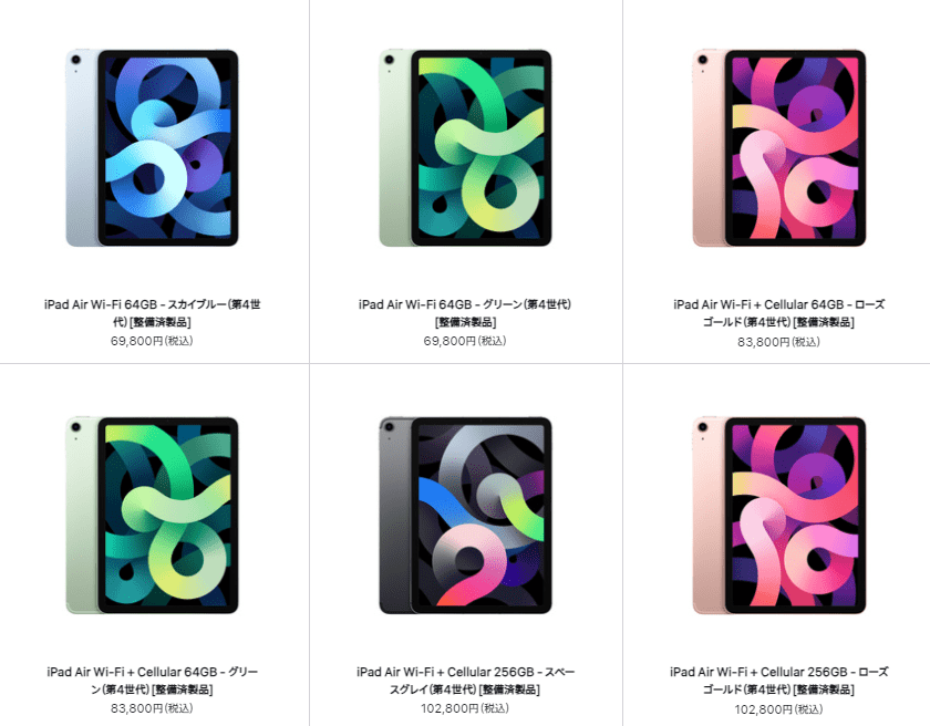 - iPad Air Wi-Fi + Cellular 256GB - スカイブルー(第4世代)[整備済製品]:10万2800円(税込)