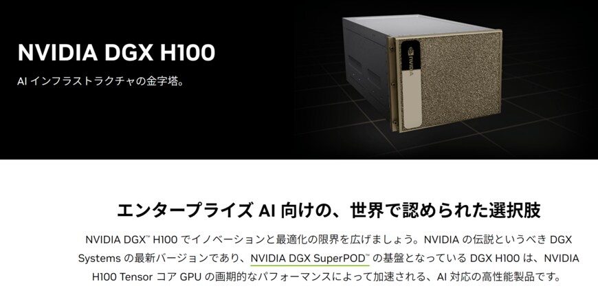 「H100」はAI向けGPU、「DGX H100」はAI向け組み込みシステムであり「H100」を8つ搭載している。