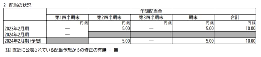 - 2024年2月期・中間配当(予想):5円