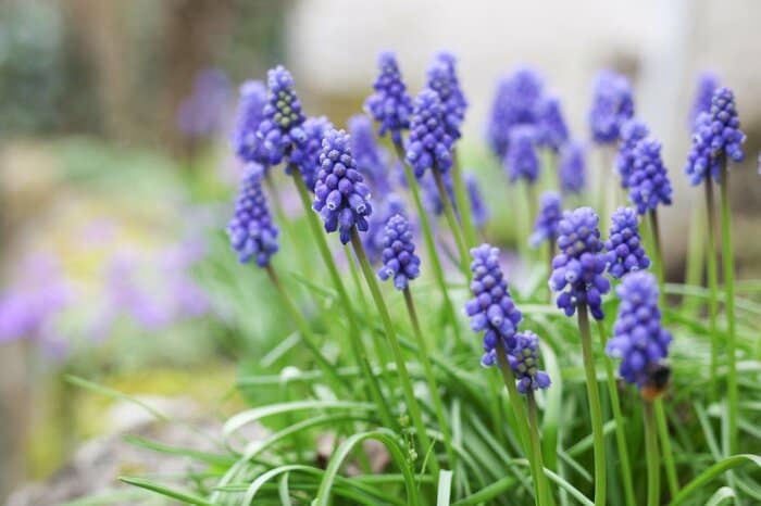 パープルやブルー、ホワイトの花を咲かせるムスカリ。ブドウの房のような花がとても可愛らしい多年草です。