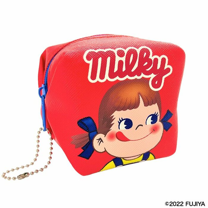 今回ご紹介する「ミルキーキューブラブリーポーチ」は、不二家の大人気キャラクターペコちゃんと、ロングセラー商品「ミルキー」をかわいくデザインしたキューブ型のポーチです。
