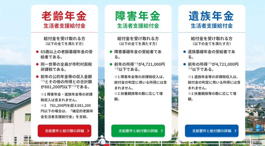 年金生活者支援給付金が支給される人は、それぞれ以下の支給要件を「すべて満たしている方」が対象となります。