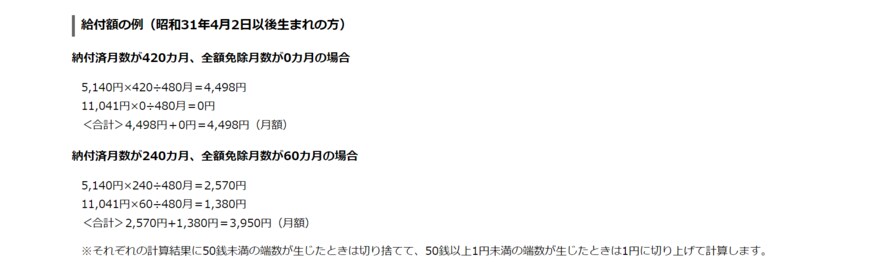 <合計>4,498円+0円=4,498円(月額)納付済月数が240カ月、全額免除月数が60カ月の場合