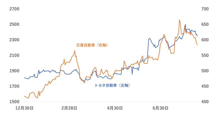 その後3月には米地銀のシリコンバレーバンクの破綻や大手金融グループクレディ・スイスの買収などに伴う金融セクターに対する懸念が波及する形で、日産自動車、トヨタ自動車とも一時的に株価が下落したと思われます。