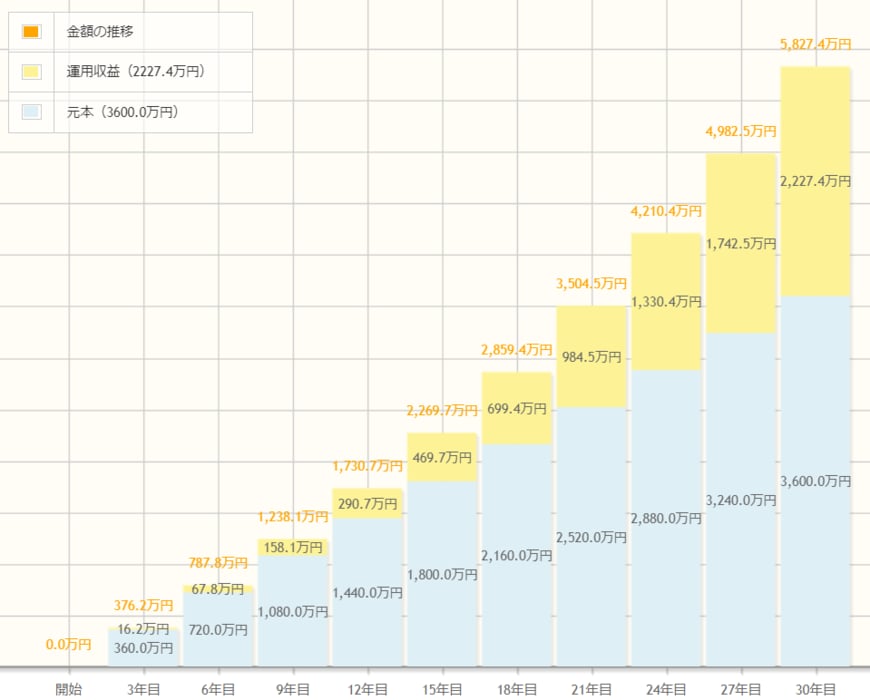 想定利回りが3%だった場合、65歳時点で運用収益は2227万4000円になりました(図表4参照)。