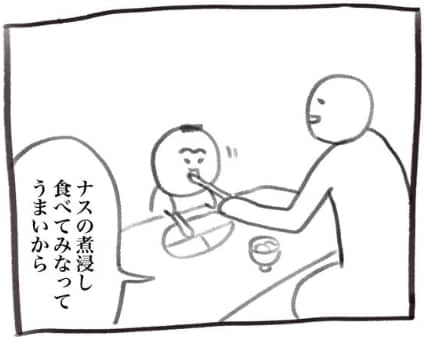 パパの「@inu_eat_inu」さんは、2歳の息子ちょーちゃんにナスの煮びたしを食べさせようとしていました。パパの「うまいから」という言葉を聞いて、ちょーちゃんは勇気を出してナスをパクリ。一体どんな反応を見せたのでしょうか…?