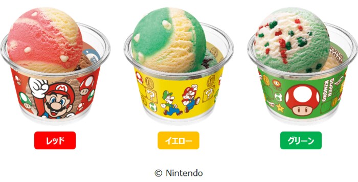 『スーパーマリオ』シリーズでおなじみのパワーアップアイテム、「スーパーキノコ」と「1UPキノコ」がフレーバーになりました。サーティワン初の白いパチパチキャンディで、「スーパーキノコ」と「1UPキノコ」の模様をイメージしています。