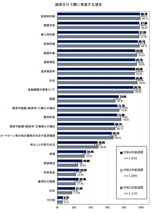 国土交通省が2023年3月に公開した「令和4年度民間住宅ローンの実態に関する調査結果報告書」では、金融機関が「融資をする際に考慮する項目」を回答数順に見ることができます。