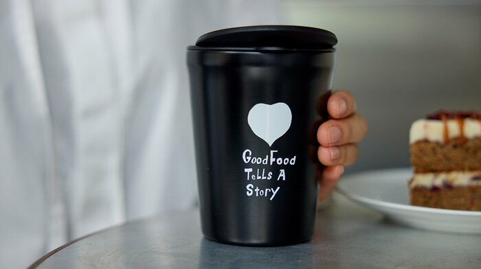 マグカップ感覚で使え、ドリンクはちゃんと温かいまま、冷たいまま。毎日のひと息に使えるタンブラーを、20周年のアニバーサリー仕様にした商品です。トートバッグと同じく、ロゴと柚木沙弥郎さんのアートをデザインしています。本体のブラックをマットに仕上げることで、ロゴやアートがより際立つように。フタはシンプルなスライド式で、広めの飲み口が付いています。