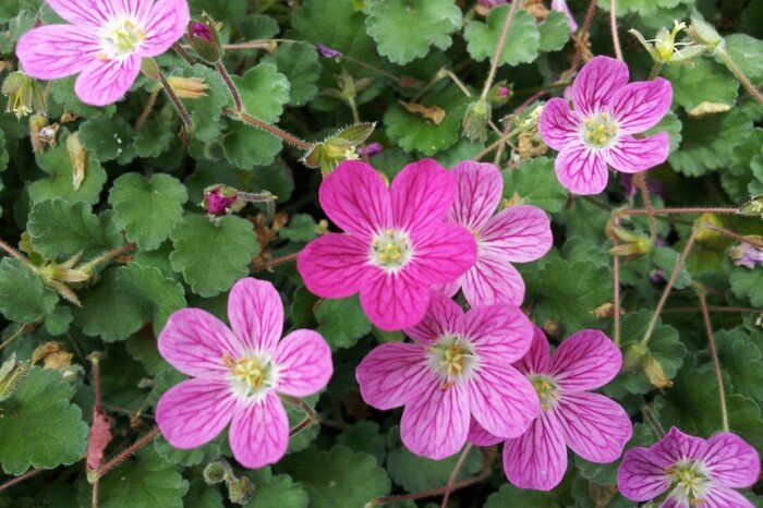 ヒメフウロソウはゲラニウムの仲間の多年草。ほふく性で花つきがよく、グランドカバーにもおすすめです。