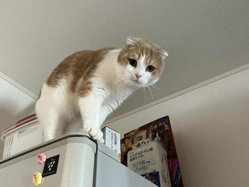 冷蔵庫の上で助けてほしそうにアピールする猫ちゃん