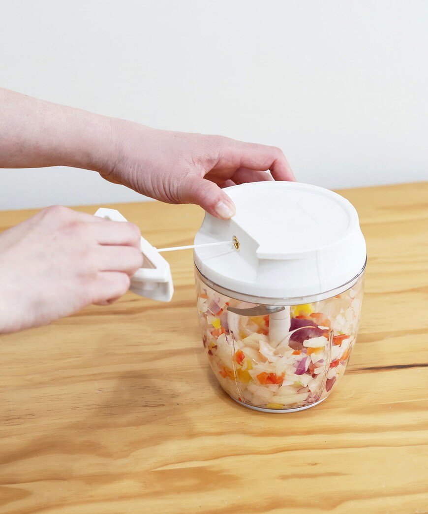 時短調理に便利なハンディーチョッパー。中サイズの玉ねぎがまるまる入るサイズで、手元のレバーを引っ張るだけで簡単にみじん切りができます。